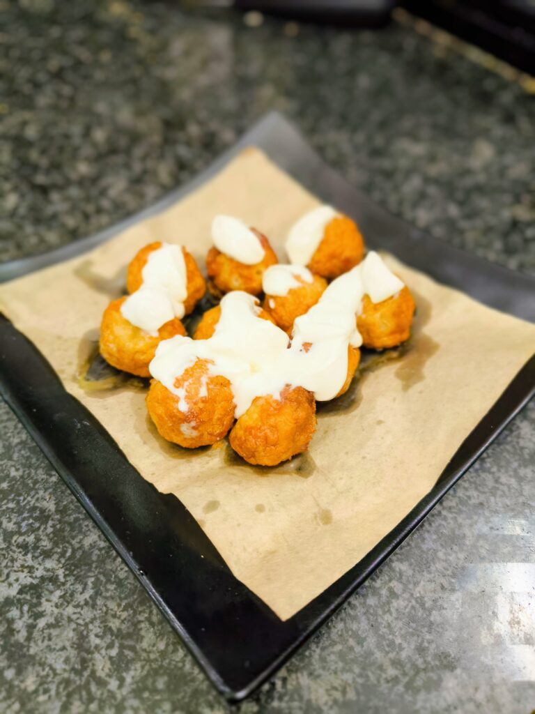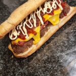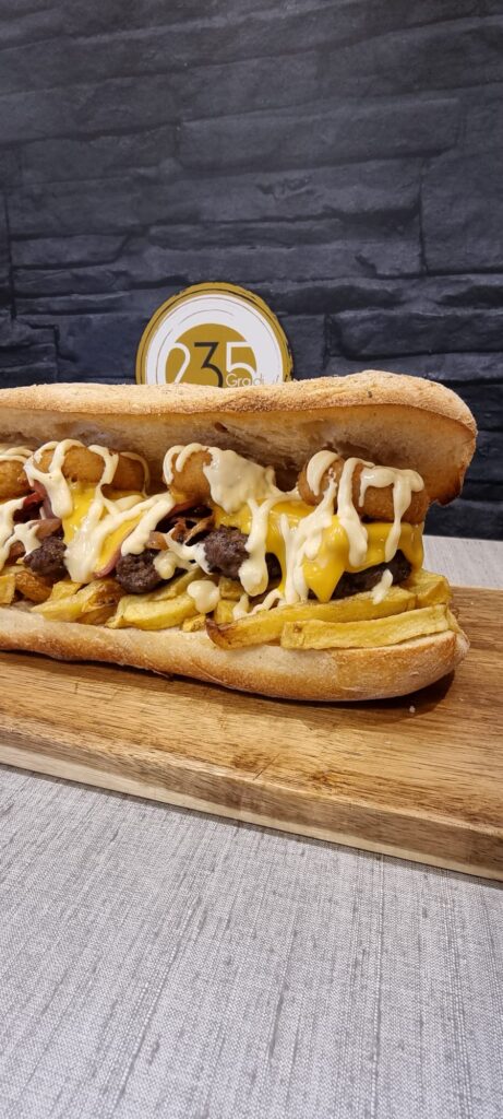 hamburger, patatine, bacon, cheddar, anelli di cipolla ripieni di mozzarella, salsa cheddar